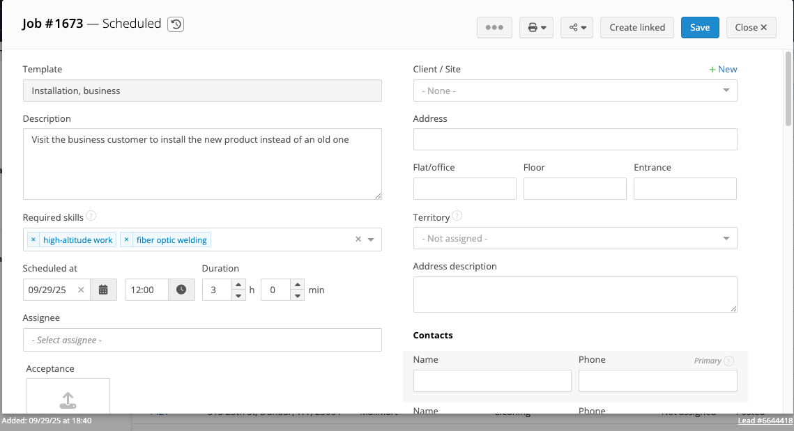 A job was created in Planado. Let's assign it to an executor and select a date.