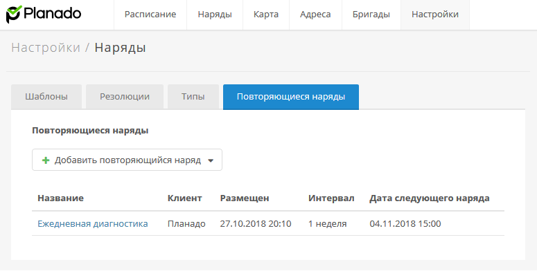 Откройте страницу Настройки → Наряды → Повторяющиеся наряды.