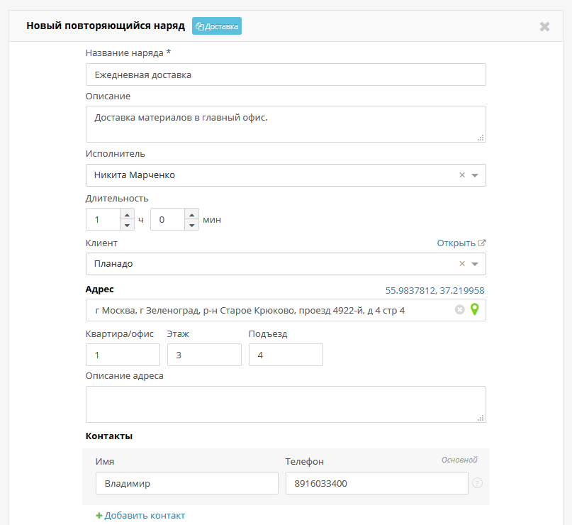 Повторяющиеся наряды создают наряды с заданным интервалом между ними. Например, так можно настроить ежемесячное или еженедельное создание нарядов для вашего клиента.